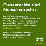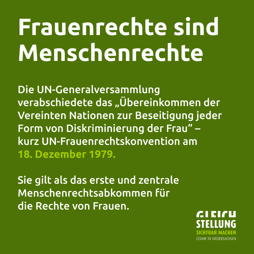Am 18. Dezember 1979 verabschiedete die UN-Generalversammlung das „Übereinkommen der Vereinten Nationen zur Beseitigung jeder Form von Diskriminierung der Frau“. Die UN-Frauenrechtskonvention ist das erste und bis heute zentrale Menschenrechtsabkommen speziell für die Rechte von Frauen. Mit der Ratifizierung 1985 ist die UN-Frauenrechtskonvention Bestandteil des deutschen Rechts – das heißt ihre Vorgaben sind für Bund und Land rechtsverbindlich. Damit ist sie ein bedeutendes Instrument für die Verwirklichung der Gleichstellung der Geschlechter.