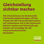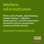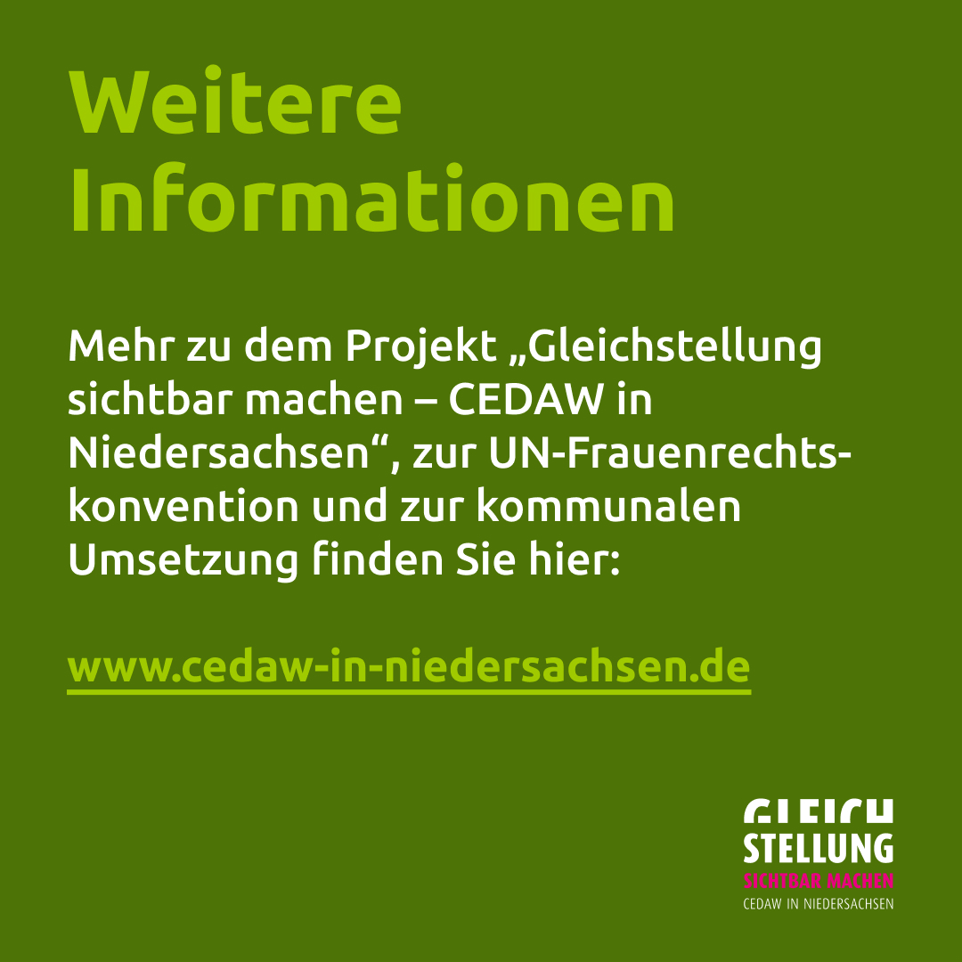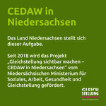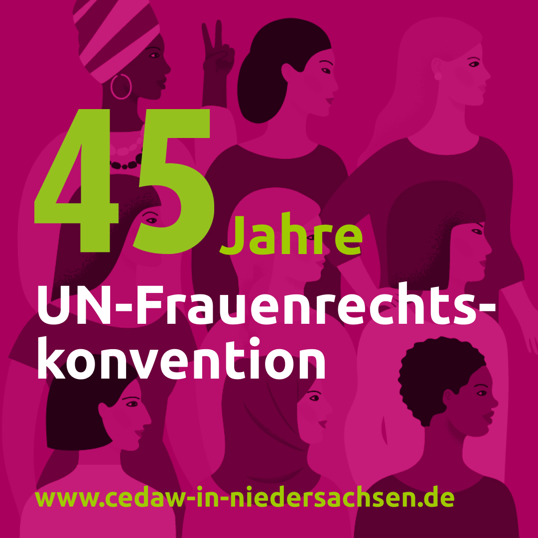 Um die Frauenrechtskonvention in Niedersachsen und darüber hinaus bekannter zu machen und das 45-jährige Bestehen zu feiern, stellen wir Ihnen im Rahmen des Projektes „Gleichstellung sichtbar machen“ vorbereitete Instagram Bilder zur Verfügung. Die einzelnen „Slides“ finden Sie unter diesem Text. Die Beitragsbeschreibung können Sie hier herunterladen.