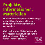 Diesen und anderen Fragen geht die Broschüre auf den Grund. Sie hat die wichtigsten Informationen zur UN-Frauenrechtskonvention gesammelt. Das Projekt fördert gleichstellungspolitische Aktivitäten, die mit den Schwerpunkten Gesunde Geburt, Existenzsicherung von Frauen, Häusliche Gewalt, Vereinbarkeit von Familie, Pflege und Beruf sowie politische Partizipation von Frauen einhergehen. Anhand beispielhafter kommunaler Aktivitäten wird erläutert, welche Wirkungsweise das Abkommen im politischen Alltag hat.