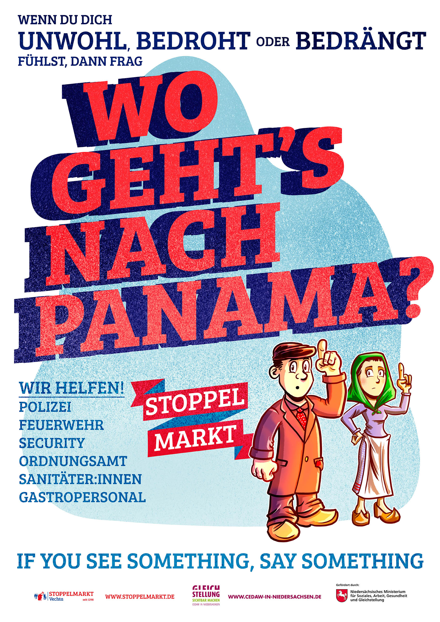 Eine großangelegte Plakatkampagne machte den Anfang. Nach dem Motto "Wenn Du Dich unwohl, bedroht oder bedrängt fühlst, dann frag Wo geht´s nach Panama?" erhielten Betroffene Unterstützung und Informationen zu Hilfsangeboten und Anlaufstellen. Die Plakate wurden im August während des großen Vechta Volksfests auf dem gesamten Veranstaltungsgelände verteilt. Das Awareness-Konzept ist nun Teil des Sicherheitskonzeptes, welches die Stadt für größere Veranstaltungen erarbeitet und soll regelmäßig aktualisiert und ergänzt werden.